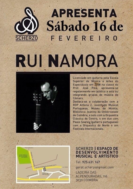 Recital em Coimbra no Espaço Scherzo Publicado em 17/01/2013 by Rui Namora 16 de Fevereiro, pelas 21h00 Obras de Luys de Narvaez, Joaquín Rodrigo, J.S. Bach e Agustin Barrios. PartilharTweetGosto Carregando... Relacionado Publicado por Rui Namora Ver todos os artigos de Rui Namora